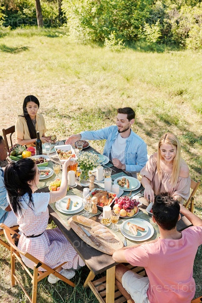Шесть молодых друзей разных этнических групп собрались за подаваемым столом на ужин