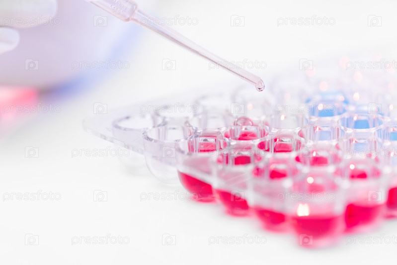 Пипетка с каплей вакцины над набором пластиковых клеток с красными и синими жидкостями