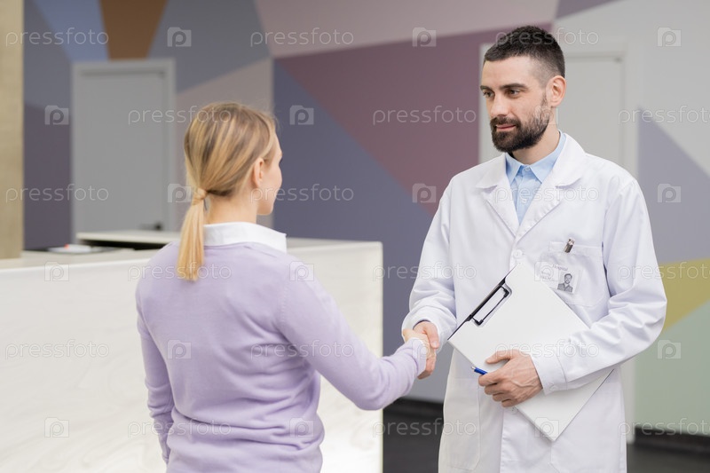 Успешный врач смотрит на молодую блондинку-пациентку, обнимая ее за руку