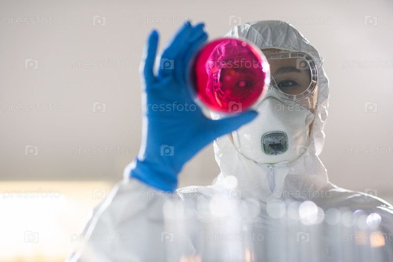 Женщина-химик изучает новый жидкий химический элемент красного цвета