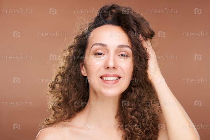 Молодая счастливая брюнетка с подними пятнами, касающимися длинных волнистых волос
