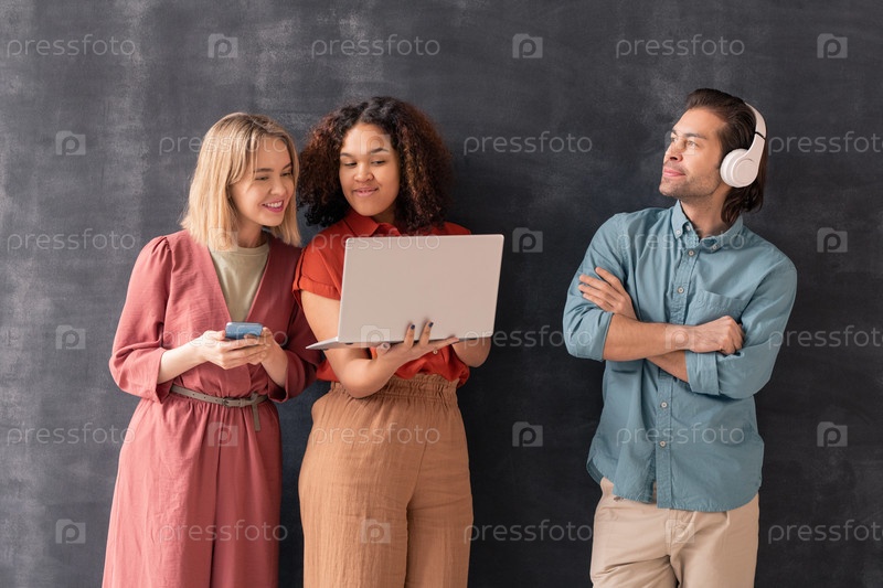 Девушка со смартфоном смотрит на дисплей ноутбука, который держит ее смешанная раса друг
