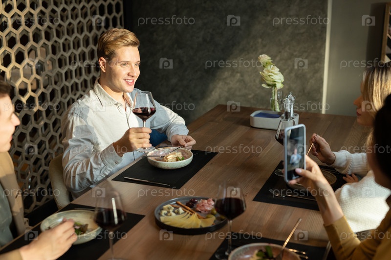 Счастливый элегантный парень со стаканом красного вина, делающий тосты за ужином с друзьями