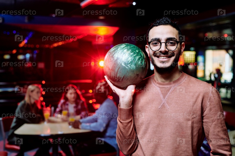 Счастливый молодой человек смешанной расы с мячом для боулинга, проводящий время в центре отдыха