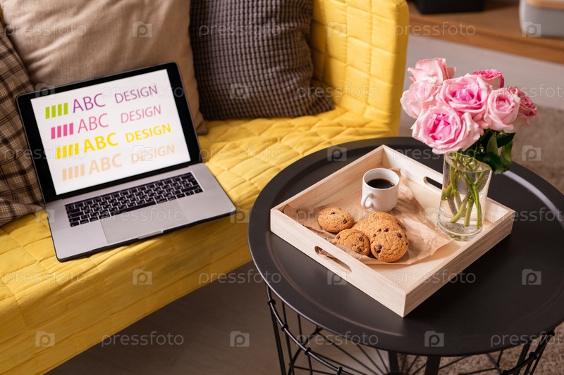 Ноутбук и подушки на диване возле маленького столика с цветами, напитком и печеньем
