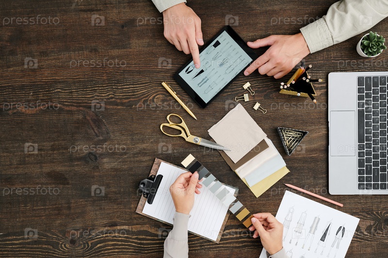 Руки дизайнера держат образцы, в то время как ее коллега указывает на эскизы