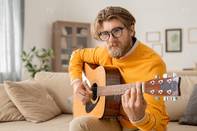 Молодой современный мужской музыкант в повседневной одежде играет на акустической гитаре