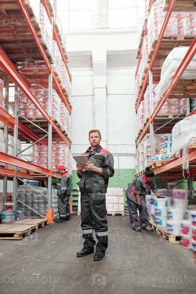 Серьезный молодой менеджер склада в униформе, использующий цифровой планшет