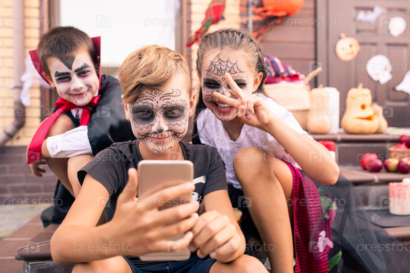 Счастливый мальчик с покрашенным лицом делает селфи, глядя в камеру смартфона
