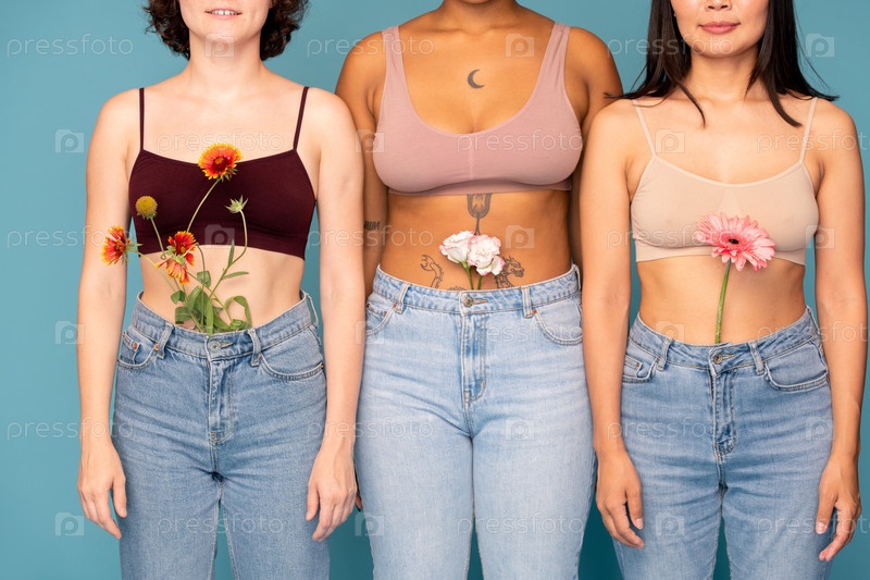 Фронтальный вид трех молодых межкультурных женщин с свежими цветами в джинсах