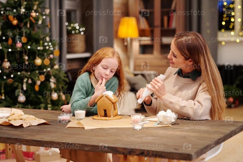 Очаровательная дочь, дегустирующая битую смесь с крыши домашнего дома