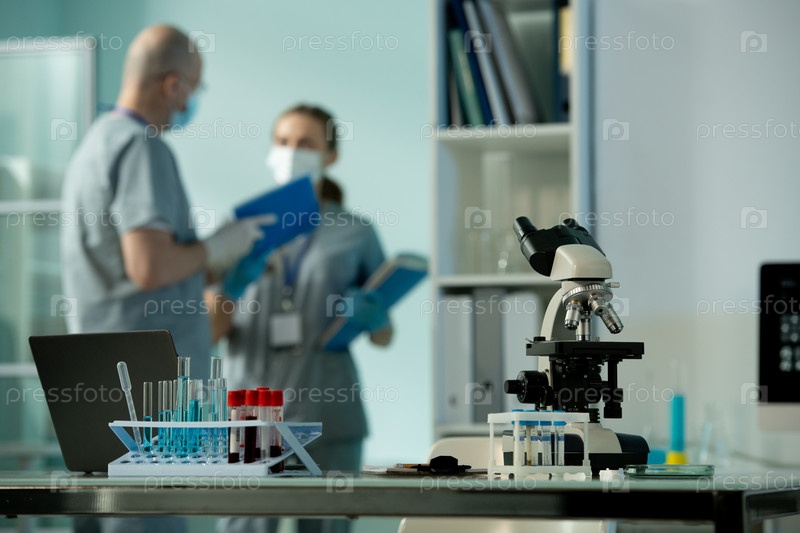 Рабочее место ученого или работника лаборатории с группой колб и микроскопа