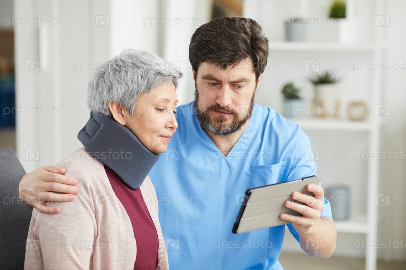 Врач с пациентом, использующим планшетный компьютер