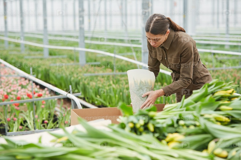 Женщина, упаковывающая тюльпаны на плантации