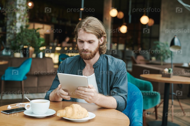 Концентрированный молодой бородатый мужчина в непринужденной рубашке пьет кофе и ест кроассан, проверяя смартфон в кафе