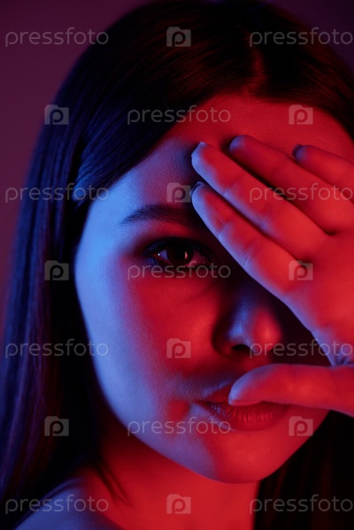 Красивая молодая женщина держит руку за лицо, стоя перед камерой