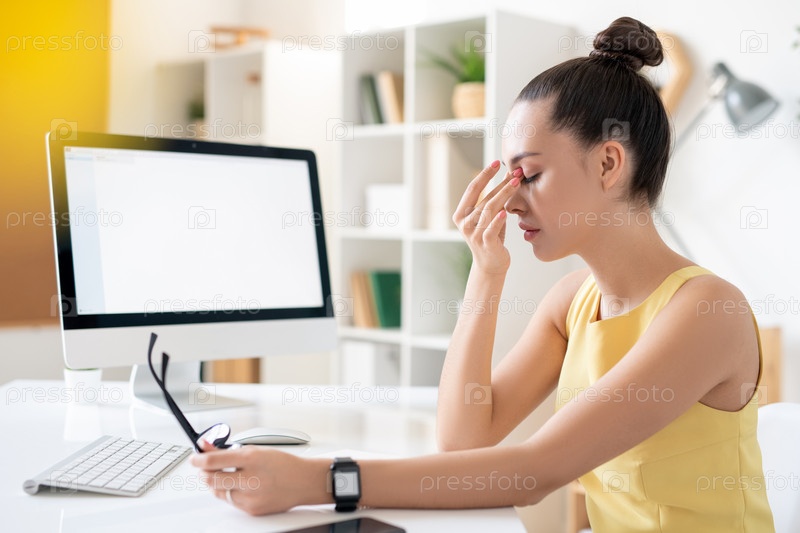Молодая усталая деловая женщина в платье, сидящая за столом перед монитором компьютера
