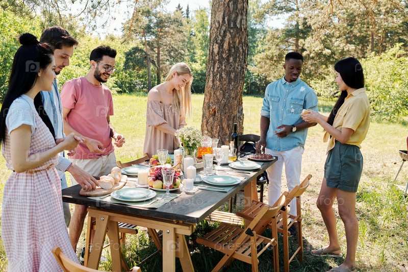 Большая группа молодых межкультурных дружелюбных людей, стоящих под сосновым деревом