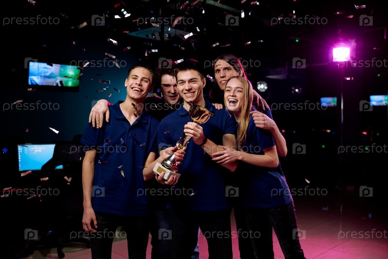 Взволнованные геймеры позируют с Кубком киберспорта