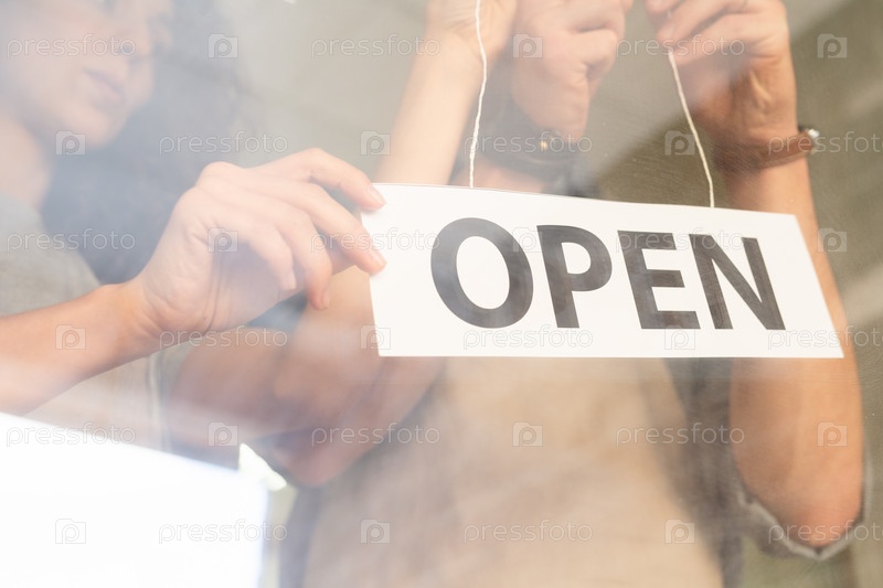 Руки молодого человека вешают бумажное объявление, объявляющее открытие на двери