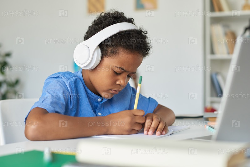Концентрированный чернокожий мальчик с кудрявыми волосами, слушающий совет учителя и решающий задания во время учебы у репетитора онлайн