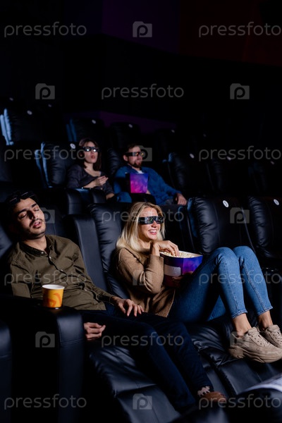 Усталый парень спит в кресле в кинотеатре, пока его девушка наслаждается фильмом