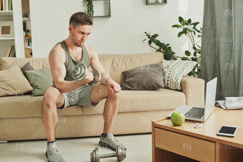Молодой человек в спортивной одежде сидит на диване перед ноутбуком во время тренировки