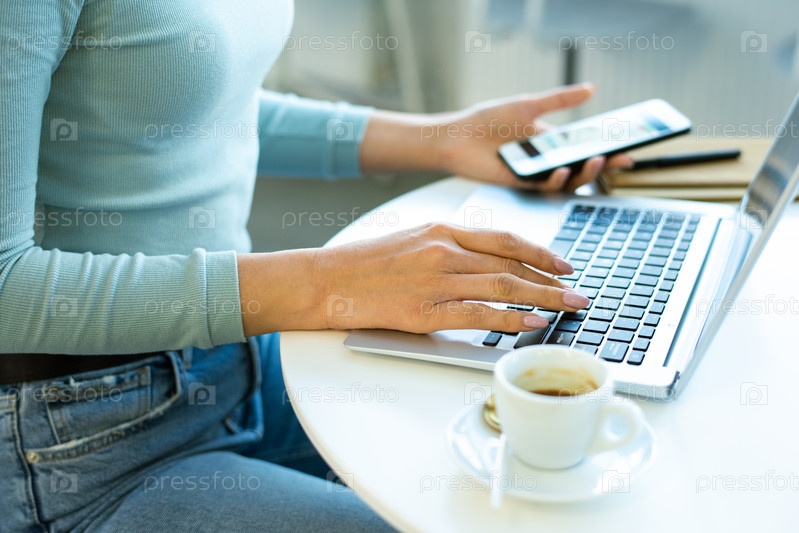 Руки молодого современного фрилансера или деловой женщины, печатающей по столу