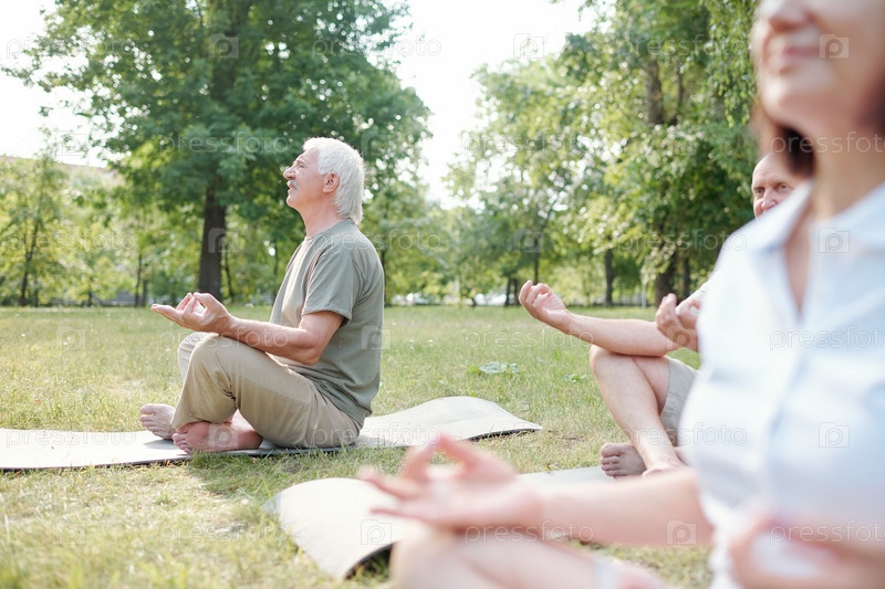 Пожилые люди медитируют в парке