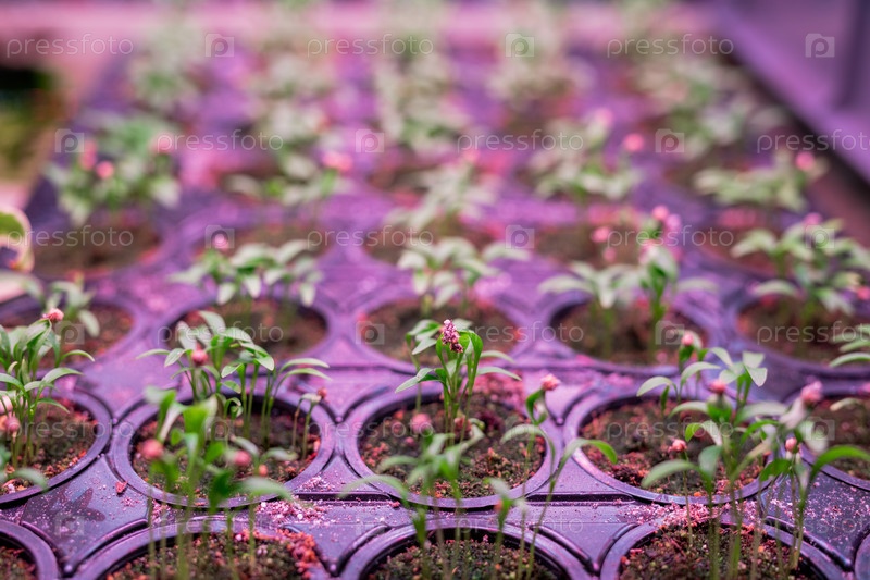 Многие ряды зеленых растущих саженцев в маленьких горшках внутри теплицы