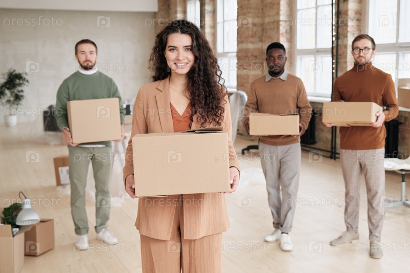 Портрет улыбающейся привлекательной владельцы бизнеса и ее сотрудника, несущих коробки для переезда при выходе из старого офиса