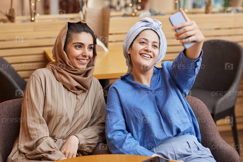 Женщины с Ближнего Востока делают селфи в современном кафе