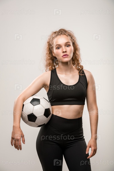 Молодая активная спортсменка в спортивном костюме держит футбольный мяч между талией и рукой