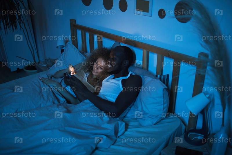 Улыбающаяся смешанная раса пара использует смартфон, лежа в постели ночью