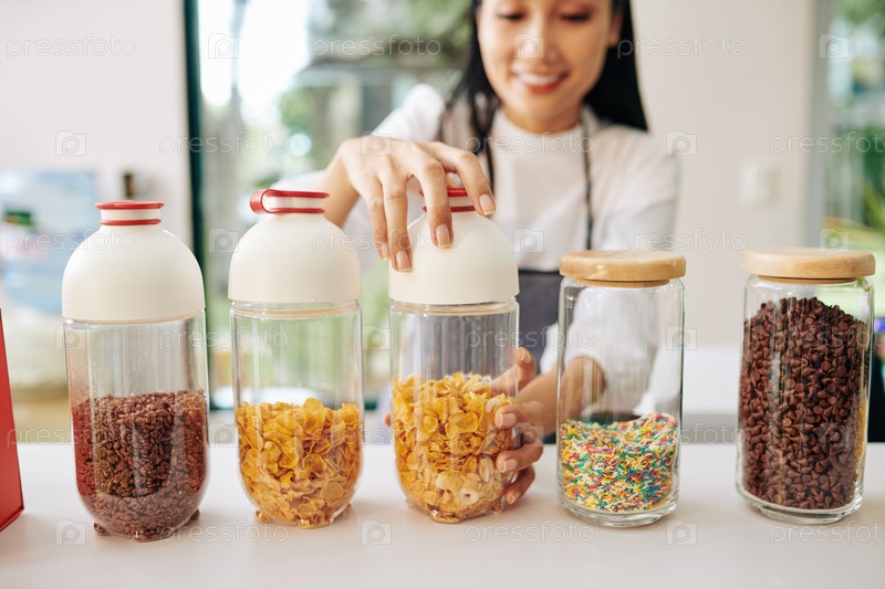 Официант открывает контейнер с кукурузными хлопьями