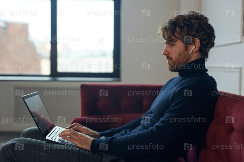 Боковой взгляд на Красивый мужчина, использующий ноутбук