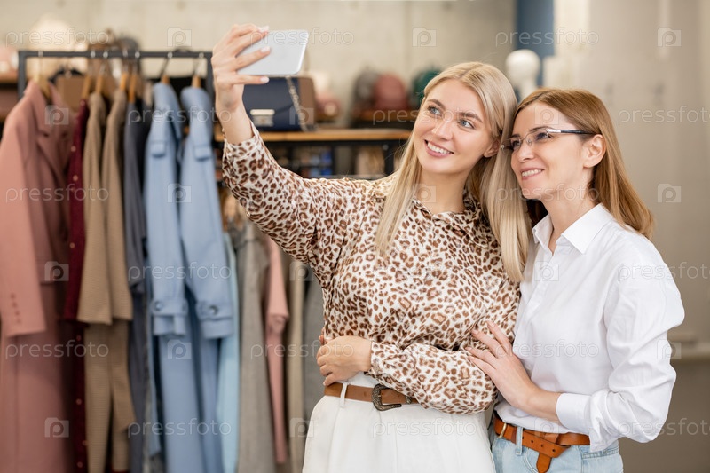 Две веселые женщины в элегантной повседневной одежде делают селфи в бутиковой обстановке