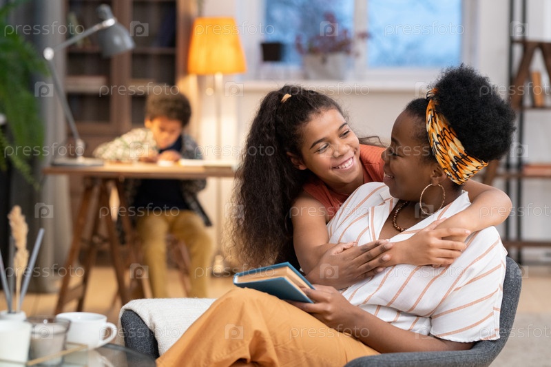 Счастливая африканская девочка с зубчатой улыбкой обнимает свою мать и смотрит на нее