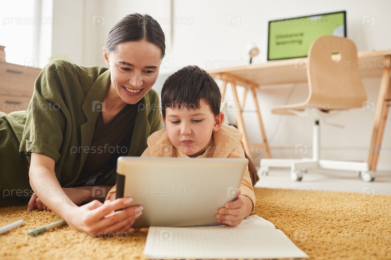 Мать и сын используют планшет вместе