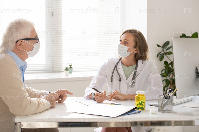 Молодой врач в белом халате и защитной маске слушает старшего пациента