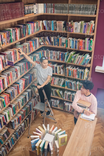 Случайная девочка-подросток стоит на лестнице рядом с книжной полкой в библиотеке колледжа