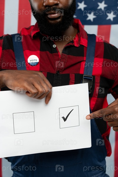 Молодой афроамериканский механизатор с избирательным значком, указывающим на бюллетень