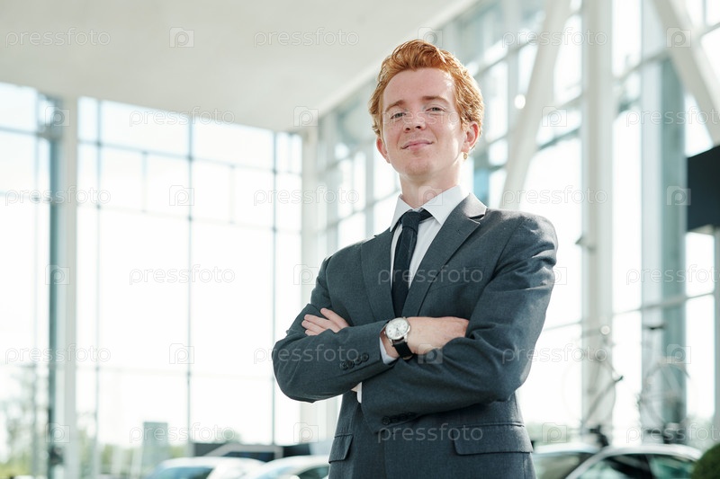 Молодой успешный мужской менеджер автоцентра, ожидающий новых клиентов