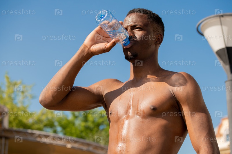 Молодой без рубашки жадный спортсмен пьет воду из бутылки во время перерыва