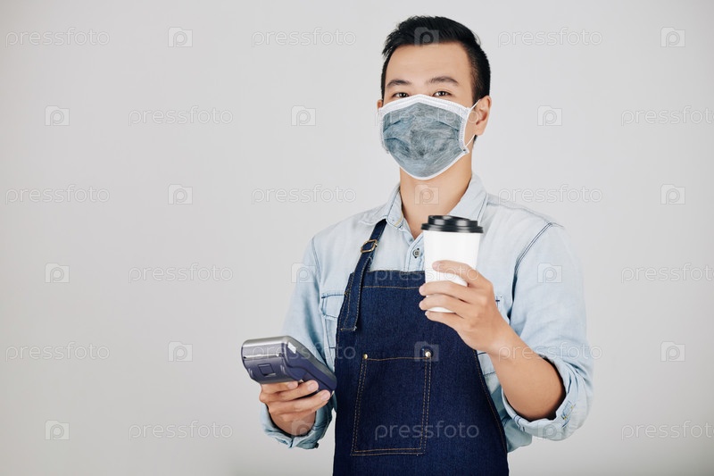 Бариста с кофе и платежным терминалом