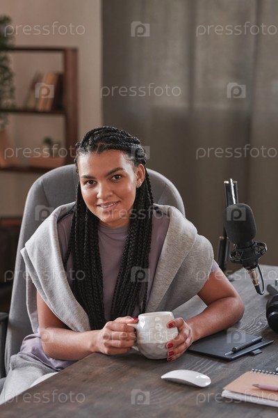 Стильная молодая женщина-влиятельница сидит за столом в верхней комнате с перерывом, пьет чай улыбается камере, вертикальный портретный снимок