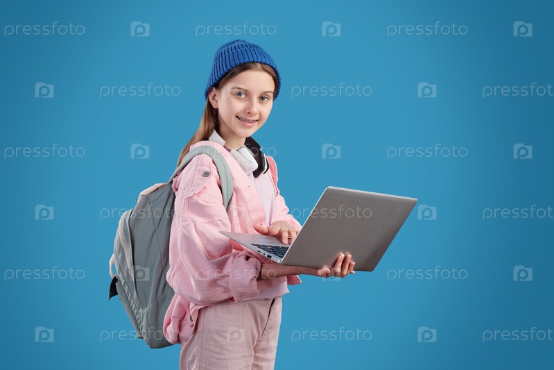 Счастливая девочка-подросток в повседневной одежде держит ноутбук и серфирует по сети