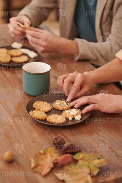 Близкий план неузнаваемых мужчины и женщины, сидящих за деревянным столом и делающих осенние печенье с забавными лицами
