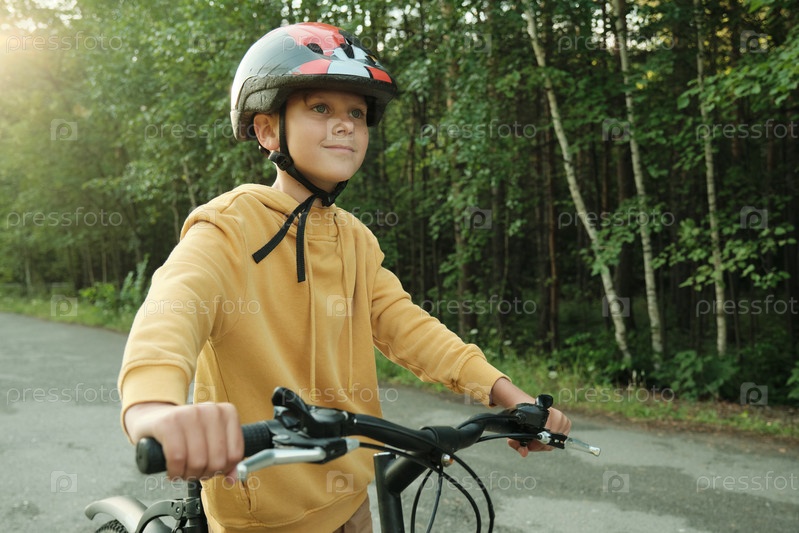 Молодой мальчик в капюшоне и защитном шлеме толкает велосипед во время прогулки