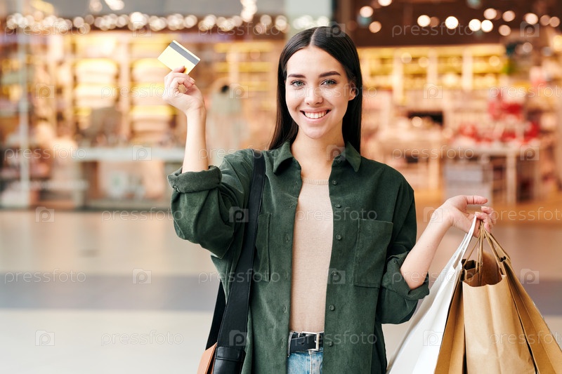 Молодая веселая женщина с бумажными пакетами и кредитной картой смотрит на тебя с улыбкой